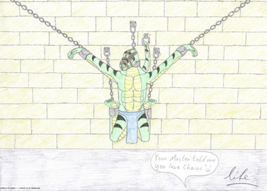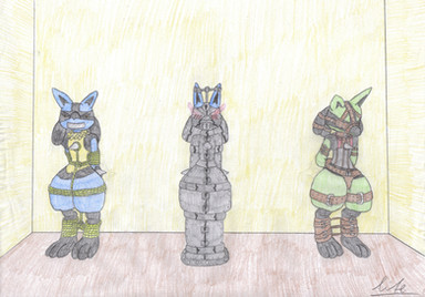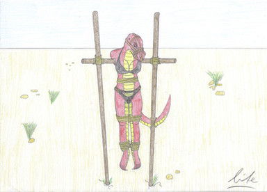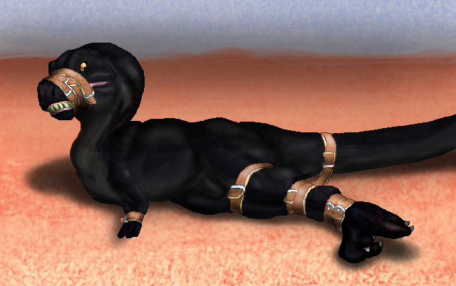 RestrainedRaptor is right, she's no threat to anyone bound so well like this! In fact it'd be pretty cute to see her hop around with those sturdy spreader bars and see how she manages. It's so cool how you have her arms and legs spread apart at nearly a raptor's neutral position. This is some very effective raptor bondage!