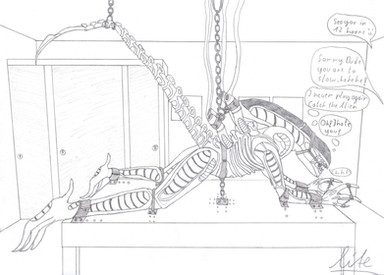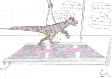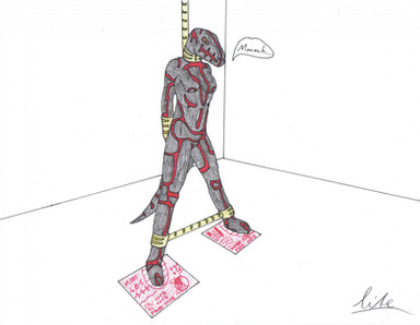 MK-4 Nano Suit Update Raptor BondageA female Raptor was caught in a Nano suit. She can not move her body, except for their tail tip.