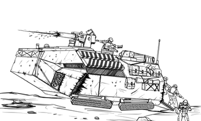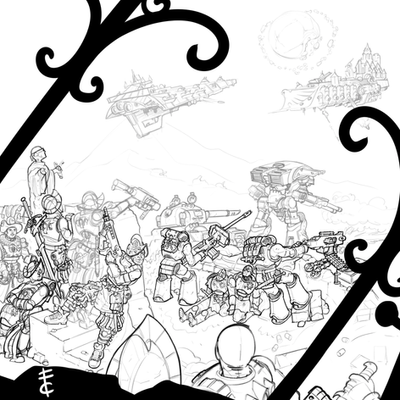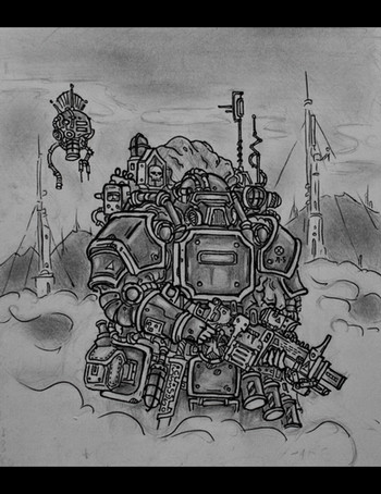 A techpriest has, unfortunately, found themselves stranded on an alien planet. They've gutted an onager dunecrawler for an impromptu shelter. They've also appropriated some metal bits to create an antenna/satellite vane, with wires dangle low off of. They are fiddling with a wrench on some kind of juryrigged device
