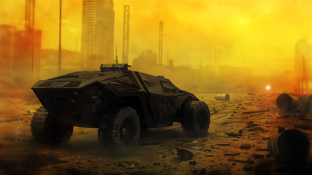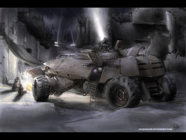 The heat was unbearable inside the vehicle. It must have been close to 90 degrees ( 32 Celsius ), it made me hate to think what it was like outside. We had to shut down the air conditioning unit to conserve energy due to the fact that we were on our 6th day past when we were to leave. Just an hour ago we were running hard across the desert, pushing the hydrogen turbine engine into the red. We had to do it, even though we were overheating and probably damaging some vital components. We had to do it because we were being hunted.We still do not know what was hunting us down but whatever it was, it is capable of laying waste to medium sized military outposts, leaving no signs of life behind. The last outpost we came across was so completely devastated that it sent a cold spike through my spine and chilled me to the bone despite the heat inside the vehicle. We thought that we were dead meat when things started to explode all around us, that is when we blasted our way out of there onto the desert wasteland.