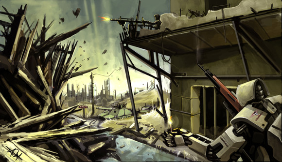 I notice the AT soldier is looking away. Distress, perhaps? Or is he just ever vigilant for other enemies? Great piece. The fact the robots would bother to finish off an enemy tells alot about them and the faction.