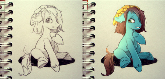 Традишколайн интересно смотрится с красками. Напоминает одного классного художника, который, к сожалению, давно перестал рисовать пони.