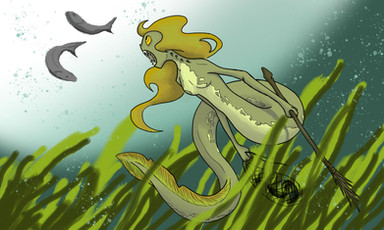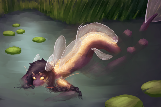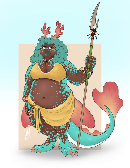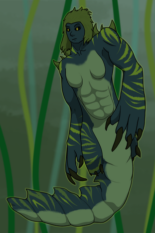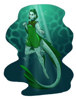 So yeah, this is Iza. She is a Sirena, a specie of amphibious humanoids from an archipelago known as the Dolorias as well as the marshes and swamps of the south of Erram. Sirenas can usually easily learn and speak foreign languages but Iza is unable to speak anything but her local dialect, which is absolutely inconprehensible to everyone else. Luckily, Anne-Marie, a lesser spirit that is never seen without Iza, know said dialect and usually translate what she say to others. Iza is very joyful and always full of energy. She is always smiling and loves to talk (even if nobody understand a word she's saying, she don't stop blabbering). She is also nearly impossible to anger, only getting sad or dismayed. She loves small animals (having some kind of very grumpy snapping turtle named Bub) and plants, often making flowers crowns or putting flowers in others' hairs. She also loves music and dance, never missing an oportunity to do one or the other. Iza is extremely friendly and loves to help, but can quickly become an handful. She also have troubles with being talked harshly or loudly, often getting scared or breaking up crying. She is pretty good with animals, usually aquatic or amphibious, and is actually able to call animals to her aid. She can either get a single large animals or a big bunch of smaller ones to do her bidding. She isn't aggressive, being very docile and passive but when she's prompted by someone she trust (usually Anne-Marie), she won't bat an eye against getting someone devoured alive by pirahnas. It is creepy to see such a sweet person just standing there smiling while someone is being tore apart. Very creepy.