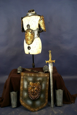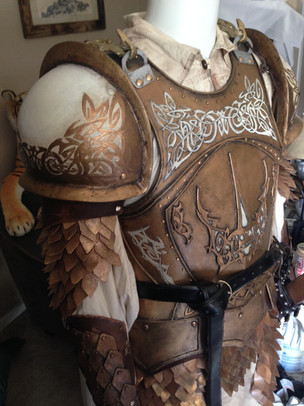 My first thought on seeing this was that it was reminiscent of the armor seen in the film version of The Chronicles of Narnia: The Lion, the Witch, and the Wardrobe. But then when I saw it in fullview, I noticed the runic inscription and the dragon designs, which made me think of Robert Jordan's Wheel of Time series. The shield is very eye-catching, but what really got my attention was the shoulders. I love the pieces that connect them to the chestplate, and that trinity-weave design on the shoulder plates is really a nice detail. Congrats on the DD.