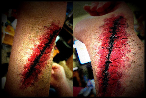 Last effort: Blood. irst of we are to line the inside edges of the open wounds with "scratchblood". This is a type of bloodeffect used to create scratches and other shallow wounds and cauterized bleeding. Apply this only to the inside edges of the wound.
