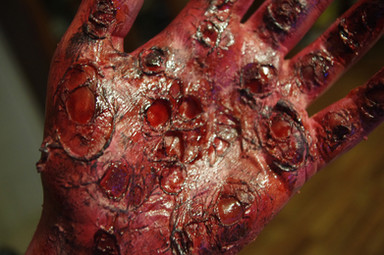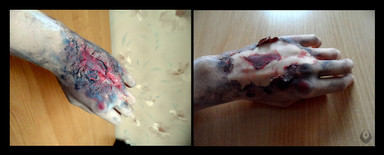 Brush Unmixed theatrical blood (dark) in the open wounds (not much, this "burn" type of injuries cauterize the bloodvessels almost immediatelly and leave little or none left to actually bleed).