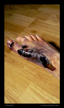Once dry, peel open the top layer of latex to create a last brigade of normal skin, rendered cinged and ripped on top of it all. Redo the process of putting makeup on the original wound to refill the gaps left by the cloth (but not too much, a little white latex showing looks great as i reseambles burned, pigmentless skin). ExTREMELEY carefully drybrush someblack over the peeled last layer of latex.