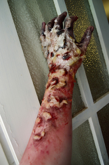 Once dry, peel open the top layer of latex to create a last brigade of normal skin, rendered cinged and ripped on top of it all. Redo the process of putting makeup on the original wound to refill the gaps left by the cloth (but not too much, a little white latex showing looks great as i reseambles burned, pigmentless skin). ExTREMELEY carefully drybrush someblack over the peeled last layer of latex.