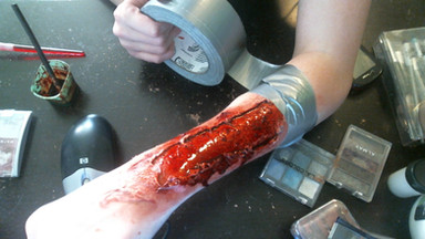 Once dry, peel open the top layer of latex to create a last brigade of normal skin, rendered cinged and ripped on top of it all. Redo the process of putting makeup on the original wound to refill the gaps left by the cloth (but not too much, a little white latex showing looks great as i reseambles burned, pigmentless skin). ExTREMELEY carefully drybrush someblack over the peeled last layer of latex.