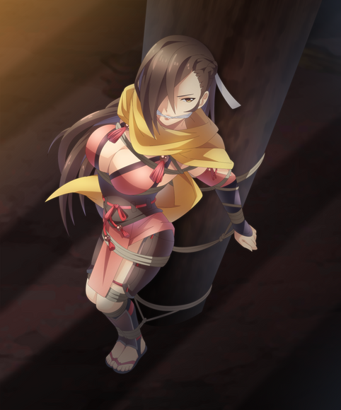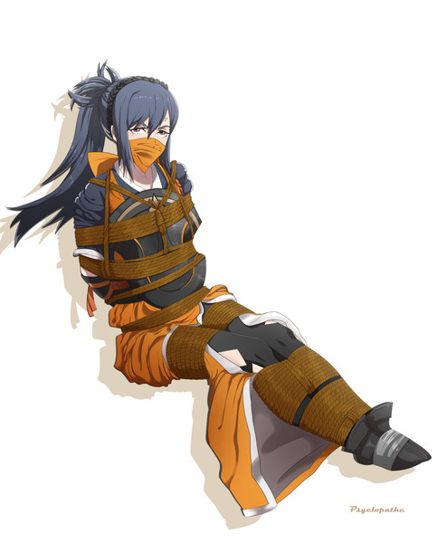 quite the cutie here, she looks nice in ropes, and with that gag. nice use of her weapon too.
