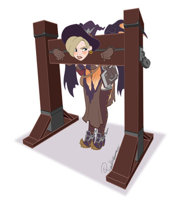 She is just a harmless witch, no need to burn her. Β Her attire is spot on from what I can see and the bondage looks sturdy enough to hold the beautiful blonde.