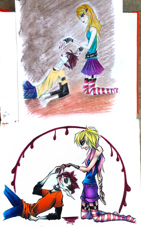 #digitalart #creepy #digitalpainting #anime #animecouple #blondehair #braidedhair #circus #emo #hoodie #originalart #purplehair #stripedsocks #timburtonstyle #seriousexpression