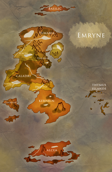 At the center of Aelevar is Eslantica, the Immortal Empire. Fortified by enormous jungles and crystal mountains, the capital kingdom of Caelum, with its waterfalls that freeze to crystal in the moonlight and its glowing midnight forests, is fiercely protected by the Immortal Kalestar. On the eastern side of the tropical forest lies the lost kingdom of the Wynged Kalestar, the only territory in all of Aelevar that does not meet the ocean with huge, steep cliffs. On the soft beaches of this peaceful kingdom, the Wyngeds were slaughtered out of existence by the Xalar legion.