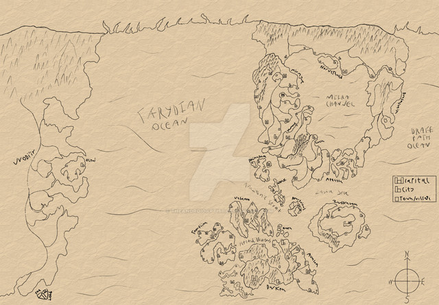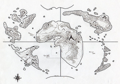 The Crescent Continent of Aelevar is where many of my stories take place and where most of the artwork on this page is featured. This is a pretty rough map, but it serves for the imagining I've been doing lately.At the very north are the Wyldlands, home to the Mutes (peoples without powers), the Stryders, Ashendras and other lost races. These lands are home to shattered rock, deep caverns and twisting caves. At the very edge of the Wyldlands is the territory of the Draelth dragon riders, Zenibrys. The land remains coarse and rough here, with harsh peaks, rocky deserts and glittering sand dunes. However, beneath these wastelands are the the moon caves of Ayre. The secret flow of water within has kept the Wyldlands both sustainable to its inhabitants as well as undesired by outside invaders.