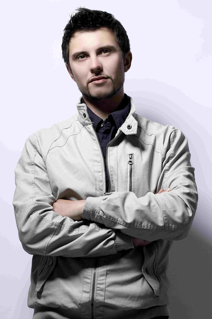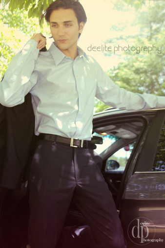 A picture taken of a male model in a suit but with the blazer held over the shoulder.Taken in a studio but photographer Thomasin Webb.