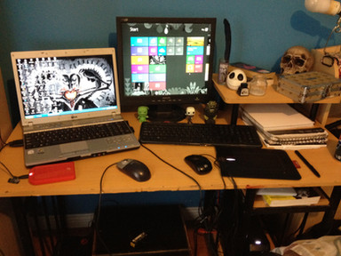 Nice working place. I wish I had a computer and a scanner in my room. So much easier to put drawings here.