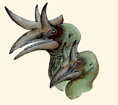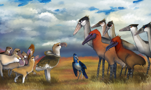Bunkinya are upright bipedal Ranamonarchiformes native to southern Ferus of the Wumbian Archipelago. Very distantly related to Pueea, they too are long-flightless flutterfrogs which arrived here over 100 million years ago, but unlike Pueea, have kept their furry integument yet entirely lost their forearms. Unlike their theropodal relatives, they stand nearly upright and run on large, plantigrade feet in an eerily human manner - but this is where the resemblance stops, for where a man's head would be the Pueea's stalked hammer-shaped one, complete with its two independently mobile eyes, rests upon a long neck of bare blue skin, with dual throat sacs on its ventral side used to produce loud singing calls and threat displays. Without arms, these seven to eight foot tall browsing creatures have instead adapted their long prehensile tongue, an organ up to four feet long, into a sort of tentacle suitable for grasping food. Continuing the trend, male Bunkinyas also have not one but two elongate and highly flexible, colorful and lily-shaped penile tentacles which though normally coiled within the cloaca may extend three feet in length when used in courtship display and copulation - in conjunction with the female's unusual double vagina.Related content