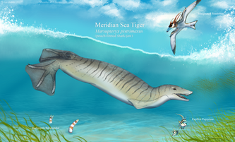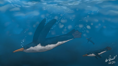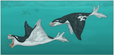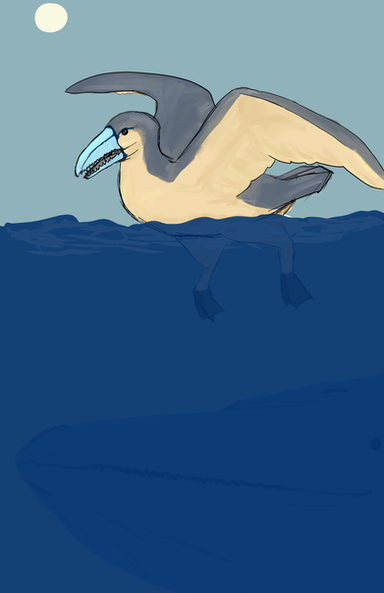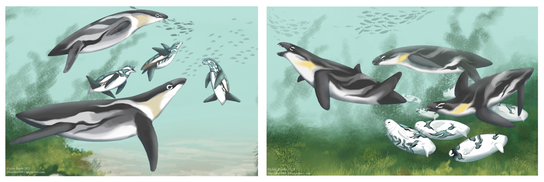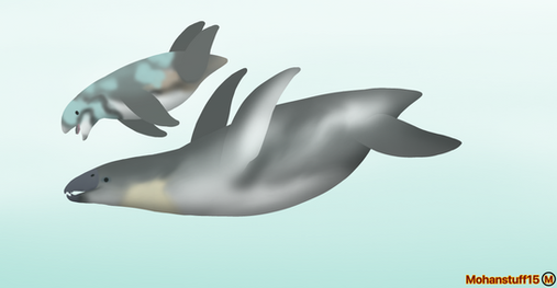 The Foons also descend from bipeds, but they are in fact mammals. Derived from beach-combing, bird-like rodents distantly related to northern Tyrannorats, they long ago lost their forelimbs, but today get by just fine with their large, paddled hinds alone. With no forelimbs to speak of, and back feet positioned at the complete rear end of the body, Foons find terrestrial locomotion very awkward, but fortunately, unlike convergently similar loons and other water birds, as live-bearers they never have to leave it and with the exception of several basal inland forms are entirely marine.