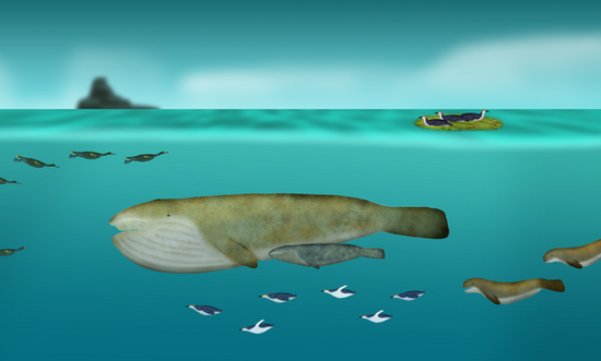 35 miles off the eastern coast of Ferus, a majestic Rose-bellied Umbul and a Greater Oceanic Whitetipped Foon come together in brief passing as they follow the shoals of fish which feed them both.Umbuls, in their great diversity, are the south-Sheatherian analogues to whales, but are actually anurans of Ranamonarchid descent. Swimming with powerful palpitations of either two-pronged fluke, their hoptoad ancestry becomes clear when one realizes that their small dorsal fin is in fact their tail, and what appears to be their tail is in fact their two conjoined hind limbs, which are fuzed at the ankle. By pulling its flukes in and out rhythmically, the Umbuls can move at great speed with minimal energy expenditure, in similar - albeit highly derived - manner to basal frogs.