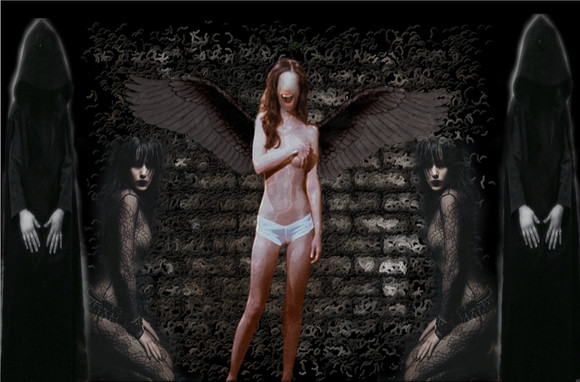 Interesting grunge work, but the wings don't really look like they fit with the woman.. She's alot blurrier than the wings so they kinda look like they're just sitting there..