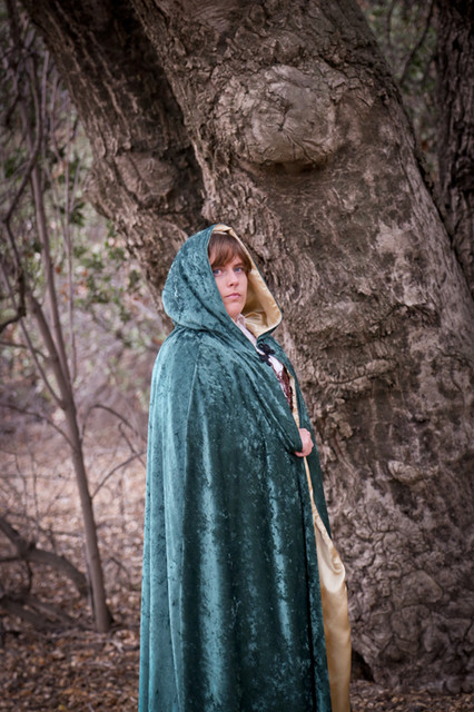 #cape #child #fantasy #female #girl #green #hood #lookingback #magic #standing #stock #wise