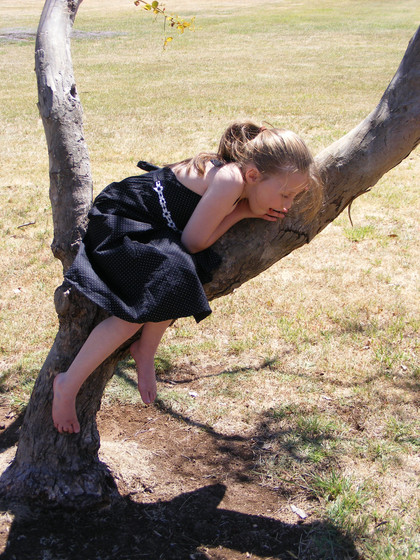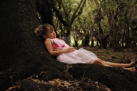 #child #female #girl #leaning #reaching #searching #sitting #stock #tree #watching #fullbodystock #curious