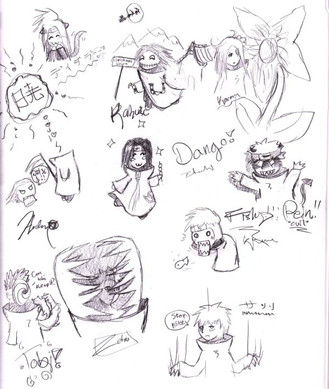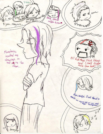 Hooray for Randomness!!!! Poor Hichigo is stopped in the process of lightling his newly bought fireworks. And Rukia releases her sword for no reason. YEah. I'm scared. Ganju is sad because his fireworks stand is sold out. AND ZANGETSU ISH A BABY!!!!!!! Muahahahahahahahahaha!!!!!!!!! Thus, the sword forms (both Ichigo's AND Hichigo's) are now reduced to butcher knives. Don't worry, chibi Ichigo was not harmed in this doodle. Urahara put Byakuya back in his head. The plot hole has Kenpachi in it if you can't tell. That's because he found chibi Ichigo and then dissapeared off the face of the earth. Him being wet created a plot hole and it sucked him up. Unohana is dumping water on Hichigo because Daricio suggested that someone put Hichigo's pants out, and since Unohana "dumped water on Kenpachi" it had to be her that nails poor Hichigo. And yes, Renji IS starting to disturb me. That's why I tied him to a rocket.previous