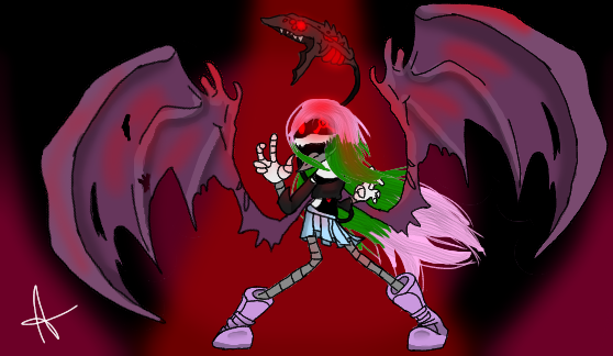 #android #belly #claws #evil #fantasy #girl #gynoid #lookingdown #oc #original #robot #stylized #wings #angrygirl #animestyle #blackandred #glowingeyes #greenhairedgirl #originalcharacter #perspective #redeyes #robotgirl #sciencefiction #scififantasy #tallgirl #longhairgirl #looking_at_viewer #spiked_hair #thinwaist #looking_at_you