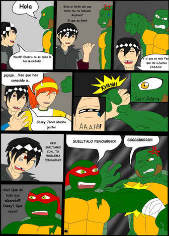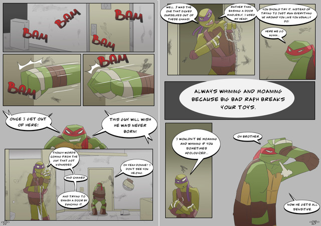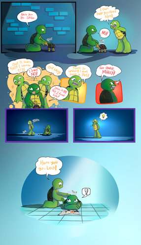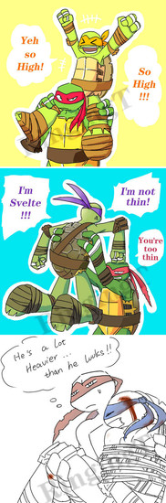 I was commissioned by plokishmok3 to draw a scenario where Mikey goes through a little growth spurt and gets a little brotherly revenge on Raph!This was really fun to draw! Thank you for thinking of me to draw this for you!
