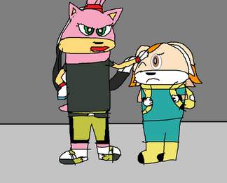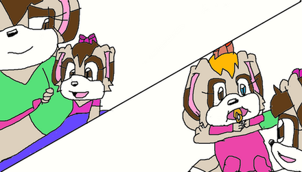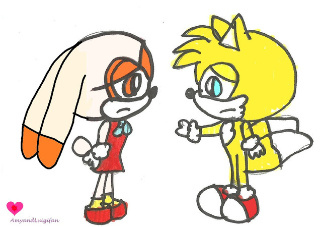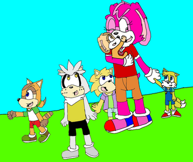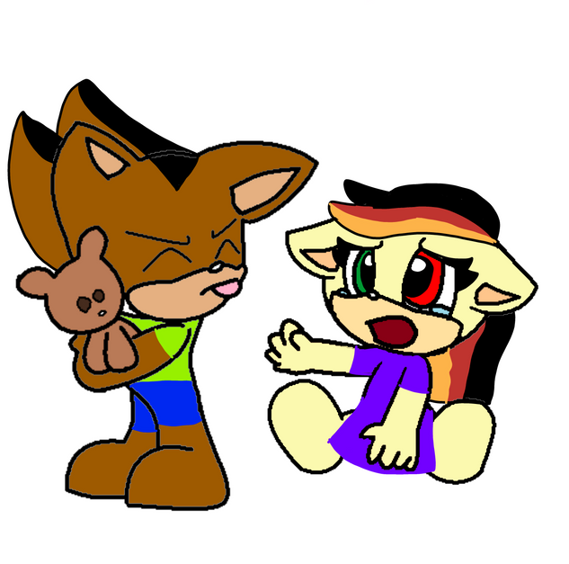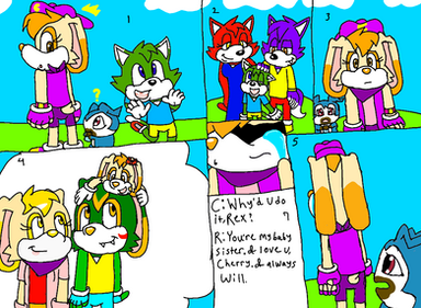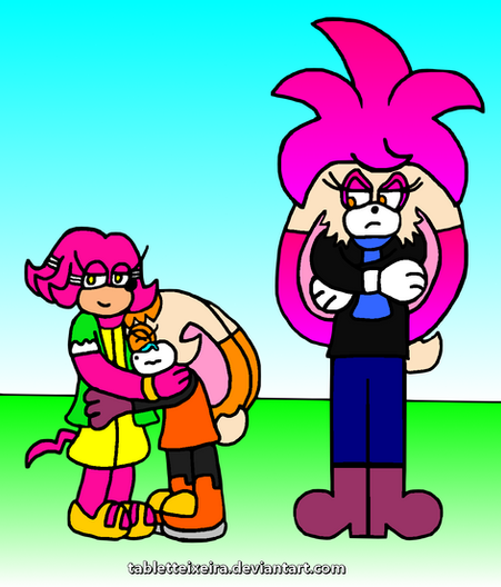 In this pic is one of Tails and Cream's sons, Runt Prower is protecting his kid sister, Berry Prower from some random bullies. Looks like their Aunt Cherry isn't the only protective kid in the Hero Squad to look for Berry. Both Prower sons are very protective of her as well.Fact: Runt looks more like his mom as his twin brother looks more like his dad while Berry is a a mixed of both their parents.
