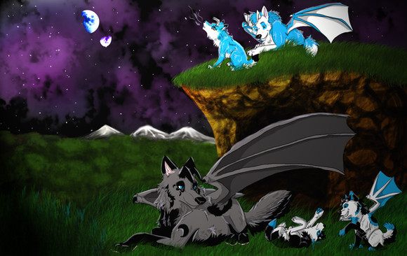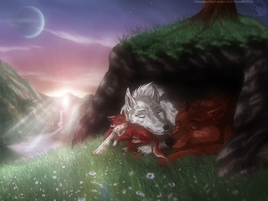 Stunning artwork. The full moon and rock cave background with the glowing light is gorgeous. I love the look of the fathers red mane blowing in the wind. Their fur has a textured and realistic look to it. Huge fan of your artwork
