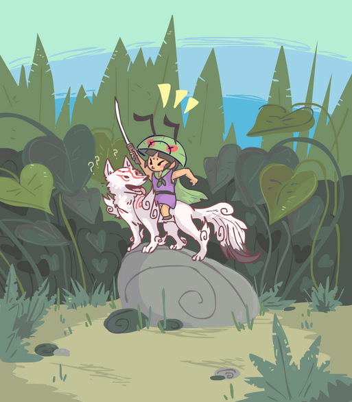Third one!!Ok . . I don't really like this one as much as the other two . . . but oh well! Turned out that I sketched it and then had to end up flipping it cause I was like "wait . . which hand does Issun use? like . . this right or left? his sword/brush is on his right hip though so does that make him left handed? ok, lets just go with left then!" lol