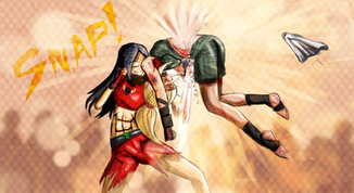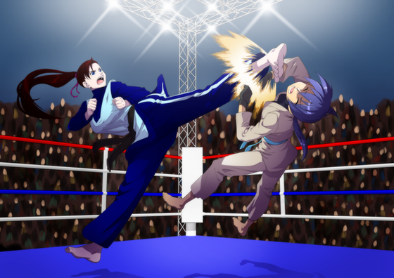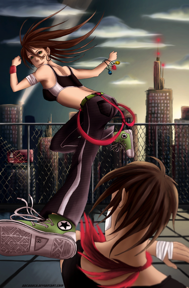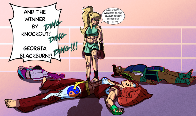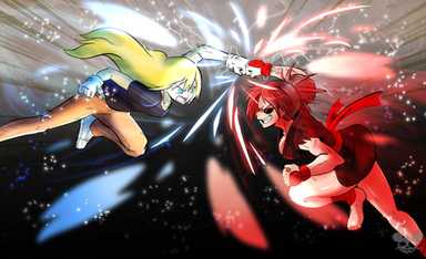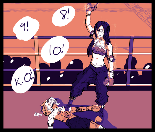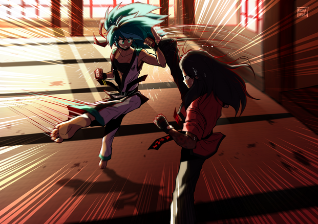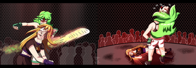 And here it is, my first artwork of 2018, featuring a battle between Georgia and Hoshiko that honestly...came out a lot grittier than expected, but I can say I'm pleased with the result.I tried a few new things for this piece, the shading style for one, and it came out really well IMO. The background/setting as well is very different as well from the WIP, being moved from a ring to...more like a dirty urban brawl. I also expanded on the more subtle features, like Georgia's freckles, and attempted cuts and bruises, they are in a fight after all.