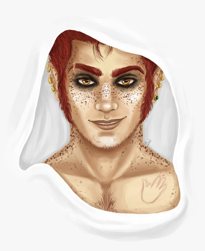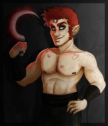 But yah, used it as a chance to deck him in the bling that he likes to wear when he's not weighed down in armour (this lad loves his gold jewellery and would happily cover himself in it if it didn't look so ridiculous), as well as muse over scars - I feel that each time he hits negative hit points in our sessions, whatever caused him to dip below zero will leave a scar, regardless of who heals him. So a scar on his chest from being impaled by a spear trap, a burn on his shoulder from those damn thoqqua, and although it's not that clear (and just looks poorly coloured >.>), a sorely burnt right hand from when he decided to touch some magical fire because he's an idiot (read: I wanted to see what would happen.. turns out it was dangerous and nearly killed him xD).