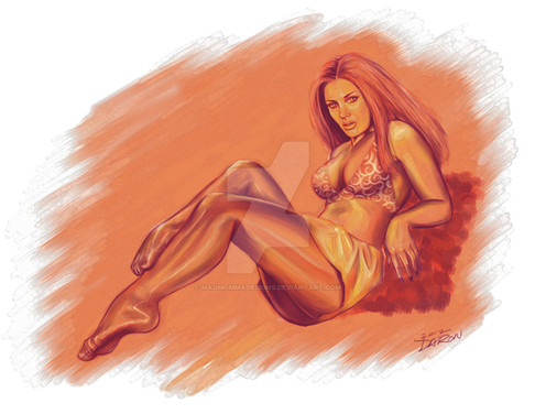 My latest digital drawing called Jennifer. It took me about 30 hours to paint. The corset was fun to do but took a lot of time.I used a photo as reference from