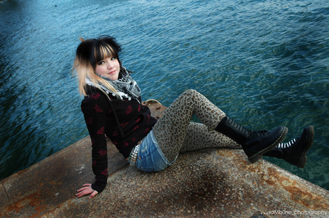Everything about this photo intrigues me: the environment, the pose, the clothing, the expression on the subject's face. The contrast between the model and the background is a nice touch too. Lovely shot!