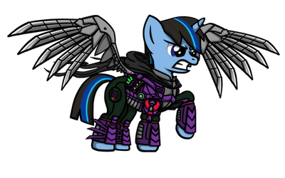 Shadow Stone is an dark evil alicorn that he's heart is totally full of darkness, hatred and vengeance, And he is also a one very dangerous evil murderer.On his back he has got two powerful mechanical appendages just like Dr Octopus but he has 4 for Shadow Stone he has just 2. but for his two mechanical appendages Shadow Stone have modified them so they have can fire lasers as well, he also wearing a evil grey helmet and body armour, on the back of his armour he's got a storm king symbol that he met the Storm King back in 2016 a year before MLP the movie, on the front of his armour he has a royal guard medal with a skull and crossbones on it, Even on the top side of his armour he got a symbol of an alicorn amulet that represents of a evil alicorn like him and he is also wearing a armband of the symbol of the villain Storm King and last of all he is the arch-nemesis of his formal friend Shield Wing.