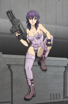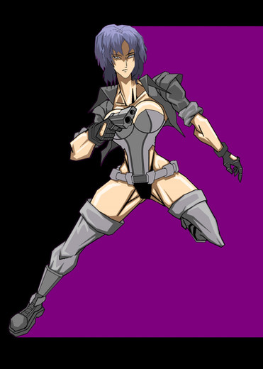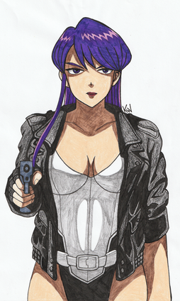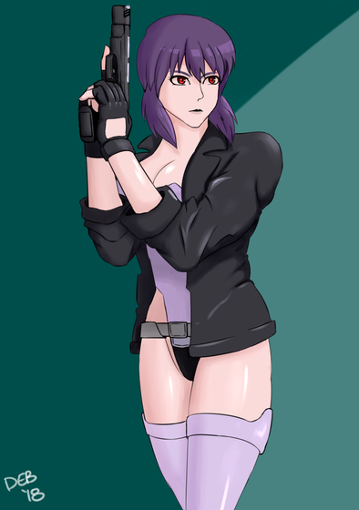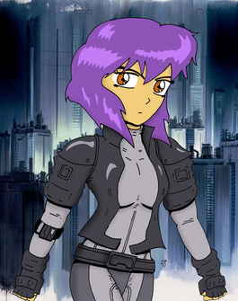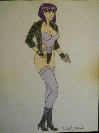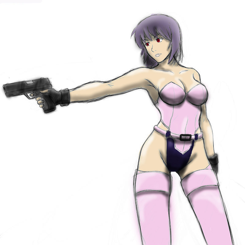 Major Motoko Kusanagi as she appears in the anime series Ghost in the Shell : Stand Alone Complex (season 1 I believe). Well, mostly. There are some details that I left out - apologies to fans. Not my favorite of her outfits and I would have gone with one the other outfits, but the above season is the only thing I watched so... I just went with what I was familiar with. It also suited the sketch that I did (see below).This actually started out as just a practice sketch of a female body and thought it turned out ...ehhh... okayish. So I turned it into an anime character : P There's a lot of stuff that looks weird mostly because I'm not used to drawing them - such as the jacket and the gun. And hands. Always with the hands. At least they don't look like blobs this time. Additionally, the face had to be redone from the original in the sketch as well (which took a while to get right because I'm still drawing on a teeny phone lol). Also, any fancy new gadgets were mostly used for the background - the rest was done with old fashioned manual work.