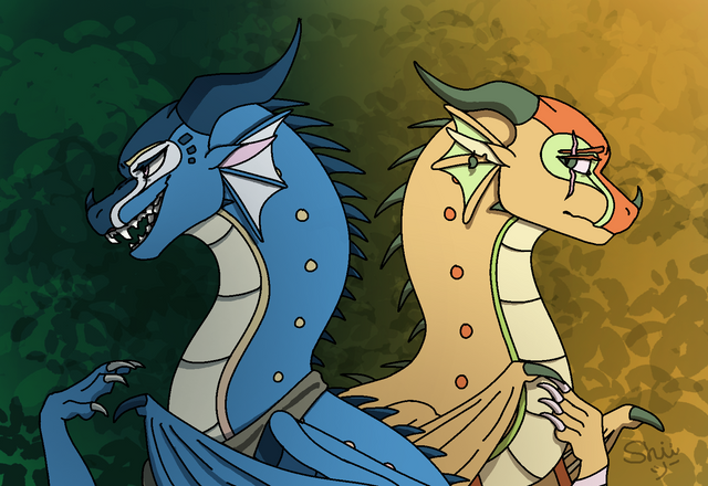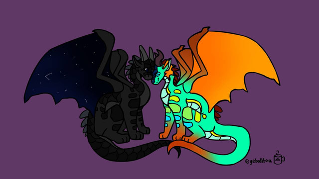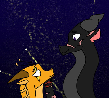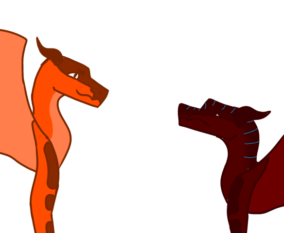 Onyx, a reserved and mature skywing, and Berry, a loyal and sassy rainwing/nightwing hybrid. These two dragons love each other (or, at least Onyx loves Berry). Unfortunately, Onyx is a fire-scaled skywing which greatly limits physical contact with dragons. Onyx can be smooth at times, but mostly he's a shy guy. Onyx and Berry met in the skywing arena, Onyx being the Queen's champion. With one glance and one heartbeat, Onyx called upon the champion's shield to protect Berry (talk about love at first sight). With some absurd luck, Berry and Onyx escaped the arena. Being fugitives, they suddenly have bounty hunters swarming after them. Will Onyx and Berry's relationship work in the end or will they part? I don't know, I have ideas for both endings.