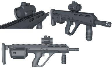 HE/AP combo rounds could be used, but straight up grenade rounds sound a bit far fetched for a rifle. For a more realistic high rate of fire grenade platform I would probably make a top mounted launcher for the full lenght version. It could fit on this CQB one, but thats getting a bit bulky. Time will tell.