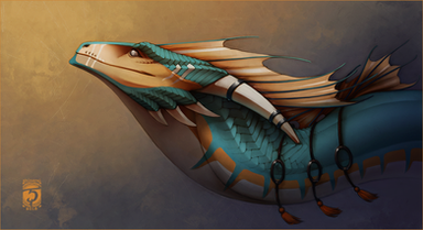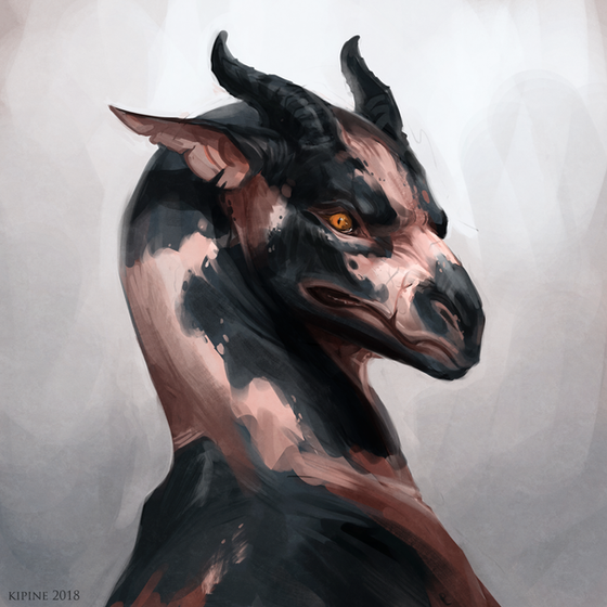 I love this piece a lot. When I came back onto your page, this was the first picture that stuck out to me because of his expression. You did really well making him look like a kind and intelligent creature. I love the shine that you have on the metal rings and the soft fluffy texture of the tassels Also, really nice work with the shading and lighting. I love how the light shines behind him and the wallpaper design you used on the wall. His skin really looks slick and the horns are a nice contrast in texture with a rougher/harder appearance.