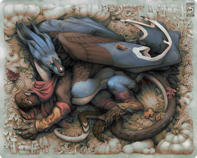 I would like to make one observation (which I'm not saying should be changed or adjusted, it's just something that's sticking out to me as I'm studying this.) The special effect on the piece almost makes me wonder if the creature is see-through especially geared lower on the neck close to the bottom corner. I can't tell if you are trying to make it look like it's raining, (if so it'd be cool to see this guy look wetter), or if it's a special layer over the creature to create a unique flair. If that's the case, I'm almost wondering if it needs to be a little more pronounced. Or even have the effect just be on the wall paper behind him. The only reason that I'm saying this is because when I looked at this closer it made me wonder if that was on purpose or if it was a mistake. Super small, hardly noticeable, I'm just a nitpicker sort of thing.