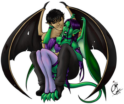 The white one is 'Zia (aka moi), and the black gargoyle is Ranmaru. His cape actually has wing-slits in it, at least that's what my husband who designed the character tells me.