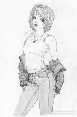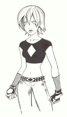 Char. Design: Well, it's a bit non-distinctive but maybe that's what your going for. I would suggest she spend as much time without that jacket as she does with it. And I'd be careful with the crucifix. If it has a meaning for the character, great. If not, then it's a bit confusing(in that I'm not sure if it is significant or if it's just a fashion whim)
