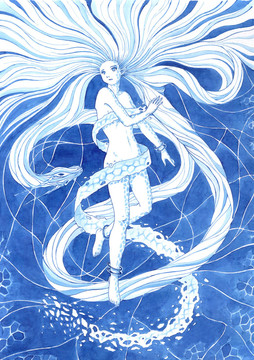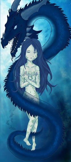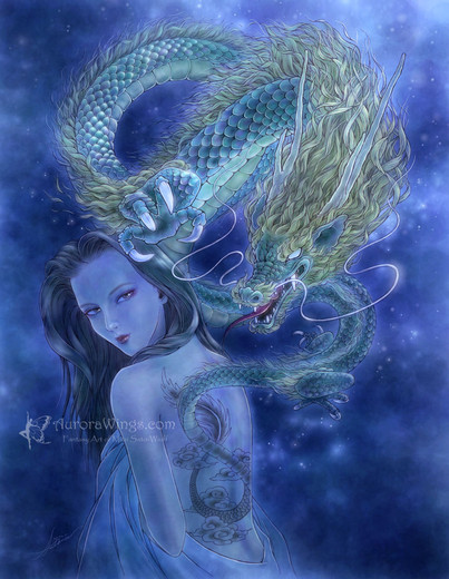 I love how the tattoo (or could it be a real dragon sneaking up her back? ) is glowing, and the water running down her back and face, making her hair all wet and slick.