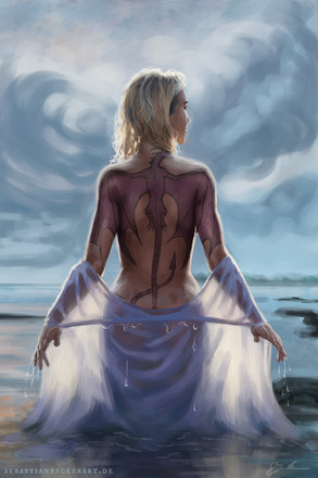 I adore it! Mostly the tatto work. Reminds me of two of my chars, but no need for much detail. I love the glow and you did a very decent job to the water. Only slight problem I see, is the water about her bum shouldn`t cruve inward, but out and around her bum. Other than that, I think it came out great, but I dunno how you originally imagined it. I know I have those moments of imaginieing pictures and they don`t come out as I thought.