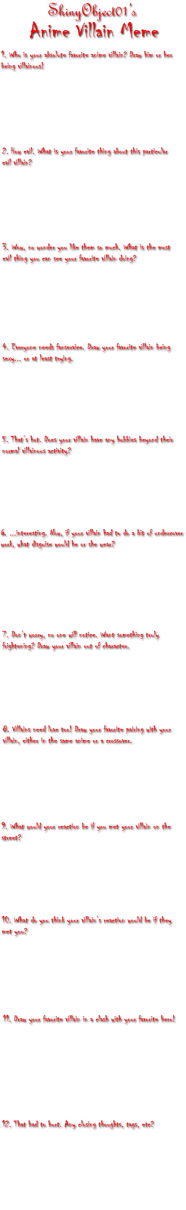 And before anyone thinks of doing the obligatory Yagami Light one... Light is not a villain, he is an anti-hero >>; Shit. Now that I've said that, there'll be a ton of people doing Light (lol) just to spite me, huh?