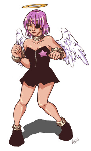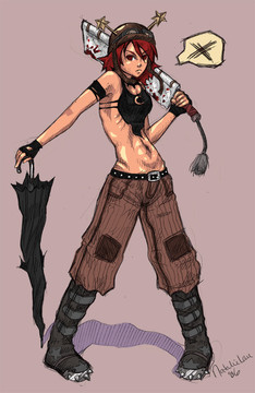 I like your design, and I like the idea of having bandages over the bust. Maybe she's a newbie at being PH, since her blade's so nice and shiny still. She could do with some more cuts and scratches maybe. But I still love it.