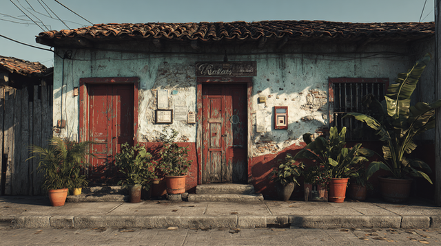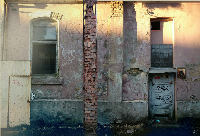 The bottom part almost looks like some grungy part of a wall...or something. And then the top like some new home...with new shutters. Amazing photo.