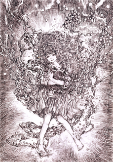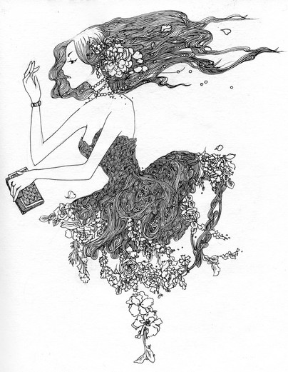 I love the flourish elements and toning of colors. Her wavy hair stretch gently to the point that her face is looking to the front is so sexy. She's kinda floating from bushes of flowers...